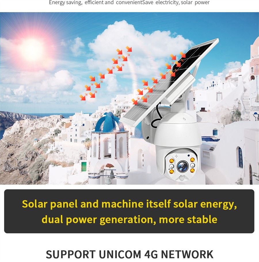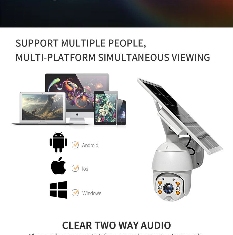 4. Pan Tilt Laajempi näkymä&vahvistin; Kaukosäädin --- aurinko-ptz-kamera tarjoaa 360° vaaka- ja 120° pystysuuntaisen katselukulman. Se tukee suunnan etähallintaa puhelimellasi. 3x digitaalisen zoomin ominaisuudet ja usean käyttäjän jakaminen, joka tarjoaa joustavamman ja laajemman näkymän sinulle ja perheille seurataksesi taloasi reaaliajassa kokonaisvaltaisesti. Valitsemalla aurinko-ulkokameran suojaat kotisi 24/7.
